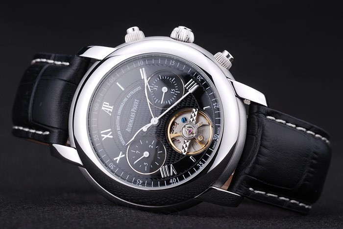 Bracelet: correa de piel de cocodrilo Negro con costuras en hilo blanco y en relieve de calor nombre y el logotipo de Audemars Piguet y un Audemars Piguet inscriben acero inoxidable flip-sobre el gancho clasp