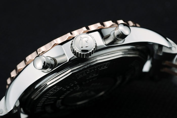Crown: pulido corona calado de acero inoxidable con el logotipo de Breitling y dos más pequeñas de empuje de acero inoxidable coronas -botón a ambos lados de it