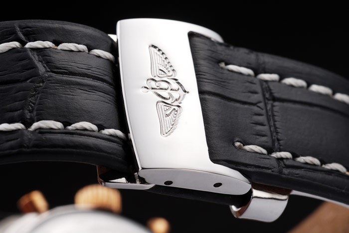 Bracelet de acero inoxidable: correa de piel de cocodrilo Negro con la patente costuras de color blanco y el calor en relieve grabados Breitling y acero inoxidable grabado doblar por la broche con el logotipo de Breitling en top