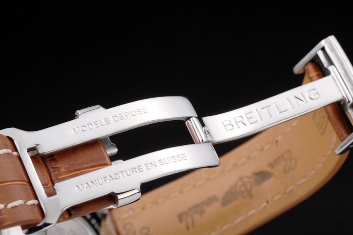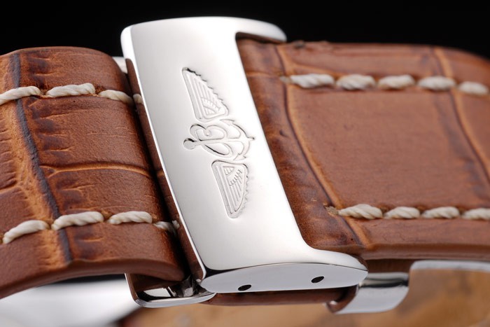 Bracelet de acero inoxidable: correa de piel de cocodrilo de Brown con la patente costuras de color blanco y el calor en relieve grabados Breitling y acero inoxidable grabado pliegan broche con el logotipo de Breitling en top