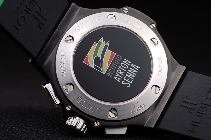 Bracelet de acero inoxidable: acanalado correa de caucho negro con Hublot Geneve en relieve en el interior junto con el verde sello de Ayrton Senna y cierre plegable gancho de la hebilla con Hublot Geneve engraving