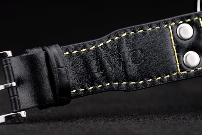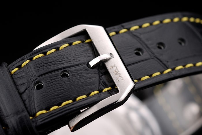 Bracelet acero inoxidable cepillado: Correa CBI calor en relieve de cocodrilo negro de cuero con costuras de hilo amarillo y grabado de acero inoxidable cepillado de gancho CBI clasp