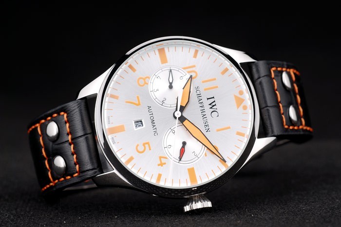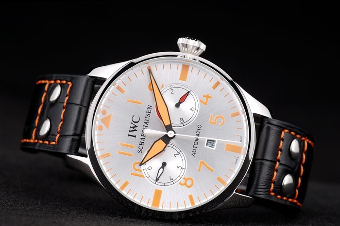 Bracelet acero inoxidable cepillado: Correa CBI calor en relieve de cocodrilo negro de cuero con hilo de coser de color naranja y grabado de acero inoxidable cepillado de gancho CBI clasp