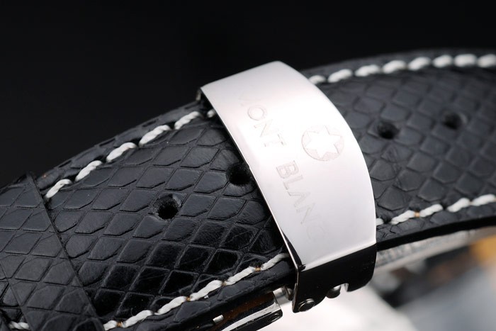 Bracelet de acero inoxidable: correa de cuero MontBlanc calor en relieve de piel de serpiente negro con costuras de hilo blanco y acero inoxidable pulido oculta clasp