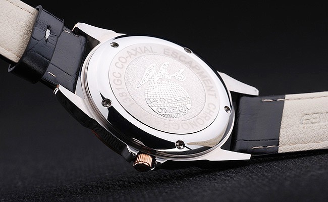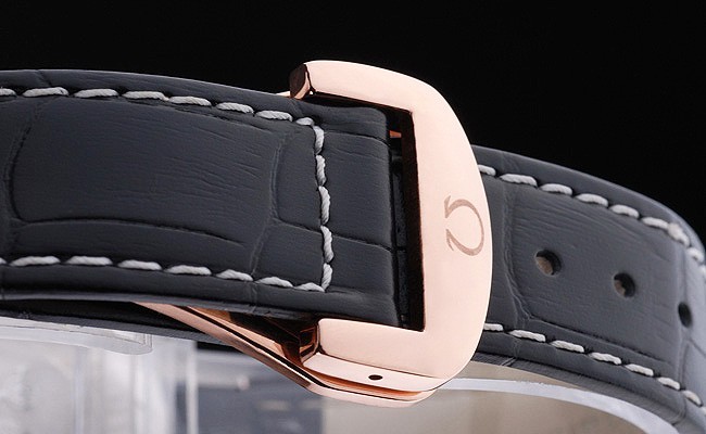 Bracelet de acero inoxidable: correa de piel de cocodrilo Negro con costuras en blanco y logotipo grabado Omega de oro amarillo de gancho hebilla clasp
