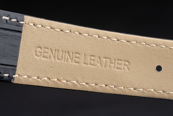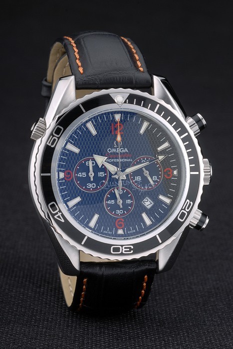 Bracelet de acero inoxidable: correa de cuero negro naranja cosida con relieve de calor sello de Omega y acero inoxidable pulido y plegable broche con el logotipo de Omega en top