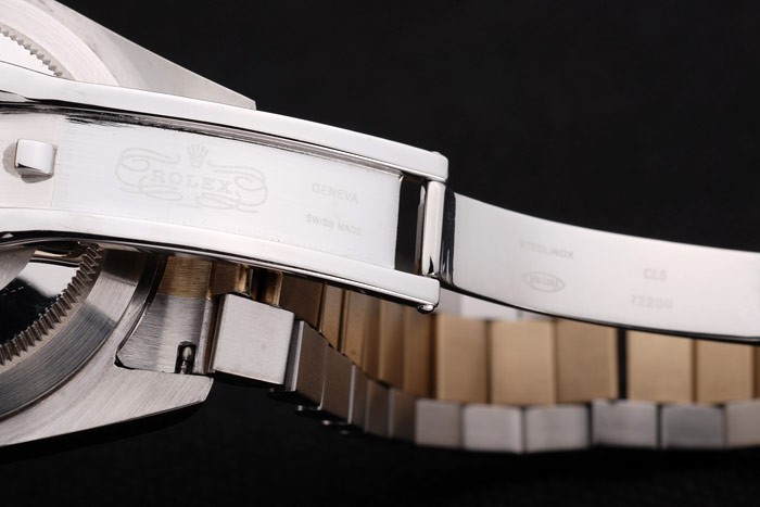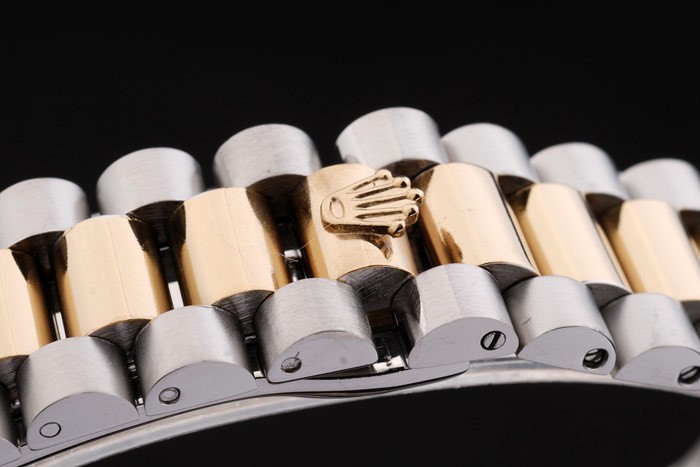 Color japonesa: acero inoxidable cepillado y amarillo cadena de eslabones de oro con el doblez sobre el corchete y Rolex corona engraving