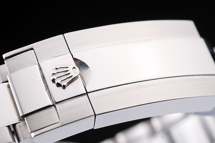 Bracelet: acero inoxidable cepillado pulsera de enlace con el grabado Rolex doblar por la hebilla mostrando la longitud Rolex logo